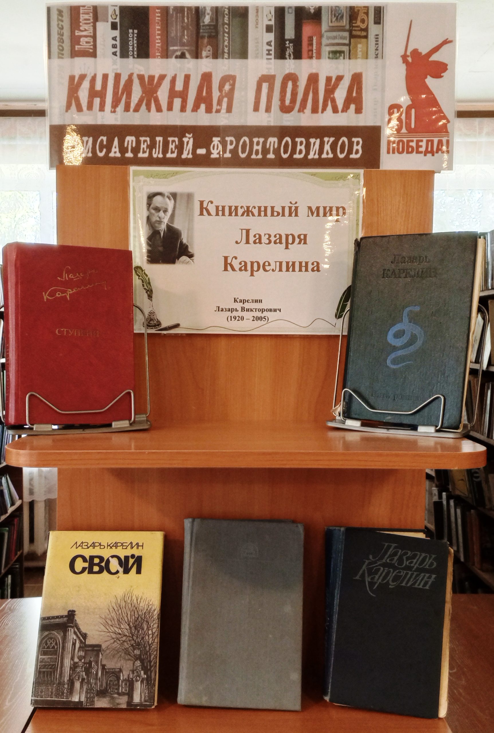 В нашей библиотеке к юбилею писателя оформлена книжная выставка «Книжный мир Лазаря Карелина».